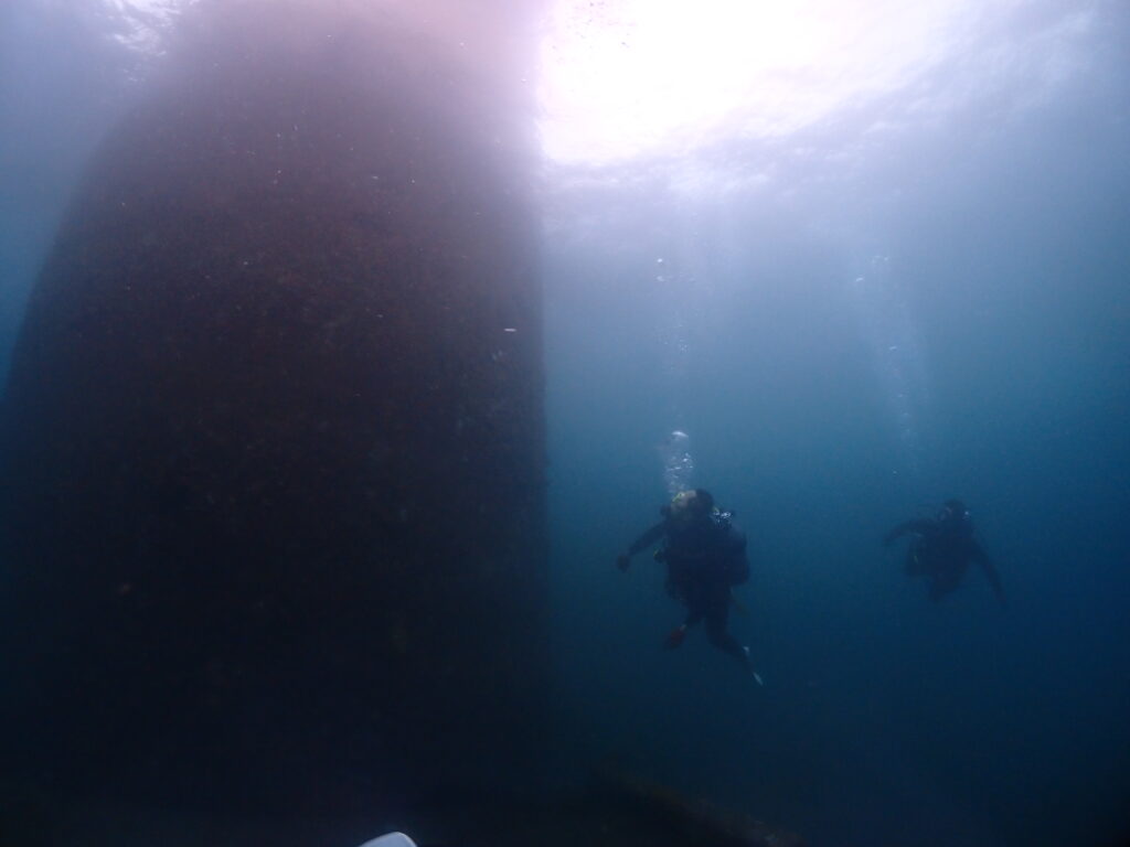 沖へ向かうといきなり現われる太い柱!それを見上げるお客様です。