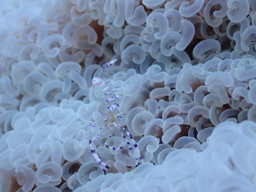 種類の違うイソギンチャクをのぞくとガラスのように透けたエビがいる。
